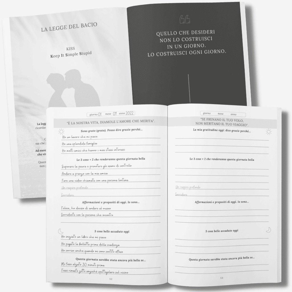 Il nostro diario è un percorso guidato quotidiano che stimola il benessere aiutandoti a creare la giornata ideale con semplici esercizi.
